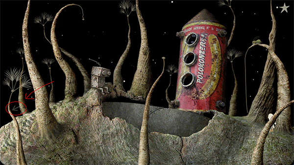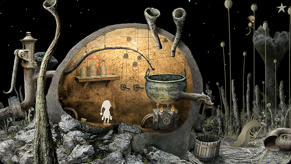 3、小人回到中间的房间,转动墙上中间的两个机关。点击右边的虫子,跳到最右边的树上,再点击跳到最左边的树上,粉撒入房间的锅子。点击房外左边向水泵一样的机关几下,水流进中间房间的锅子。