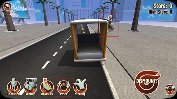 根据选择的不同车型,木头人可以摆的姿势也不一样,姿势基本上可以分为车内和车外两种类型,也许玩家会觉得在车外的姿势更加风骚和有趣,但是小编推荐最好选择在车内的姿势。因为如果选择木头人风趣地挂在车外,木头人很容易就会在中途掉下,不能到达玩家预期的位置,从而获得的分数也会很少,相对的,在车内的姿势则会更加保险。