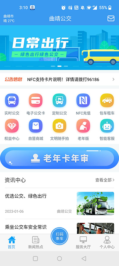 曲靖公交app是一款服务于曲靖市民的掌上智慧公交服务软件,用户可以通过该软件来查看全面的公交详细信息,支持乘车扫码支付,为用户乘公交出行提供便捷。并且还提供了热点新闻资讯,帮助用户轻松了解曲靖发生的大小事情!