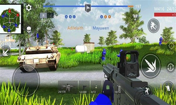 - 夺旗模式:双方分为红蓝两队进行对抗,通过夺旗和击倒对方获得积分,积分超过对方200分或者占领全部旗子,可获得胜利。