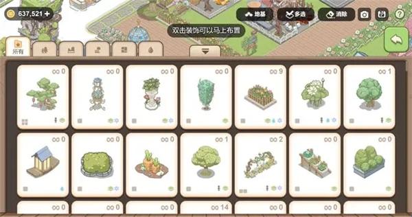 造景模式点击右上角“地基”按钮,可以所有装饰变成平面图,避免装饰遮挡方便摆放。