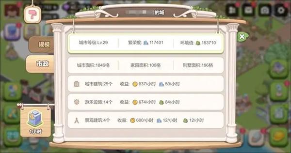 城建装饰来源于等级树的繁荣线任务,包括基建设施、游乐设施和景观。竣工结束的基建设施每小时会产出金币和繁荣度,竣工结束的游乐设施每小时会产出金币和环境值,景观每小时产出金币、环境值与繁荣度,三者收纳后也不会影响产出。