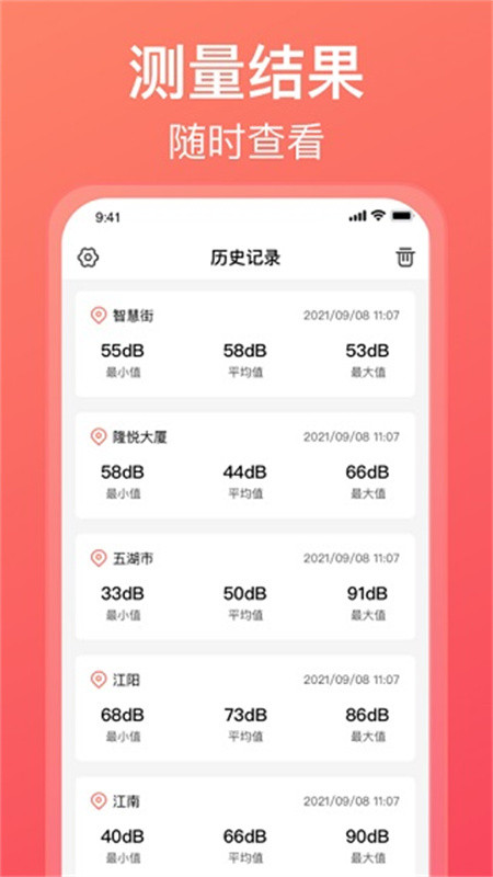 分贝测试仪最新版是一款非常好用的测试分贝软件,里面的功能都是非常专业的,有着非常小巧易用的软件可以免费使用,轻松记录各种声音,能够检测各种高低的噪音,功能显示齐全,设备灵敏度非常高。并且所有的功能都是免费提供,没有任何的限制!