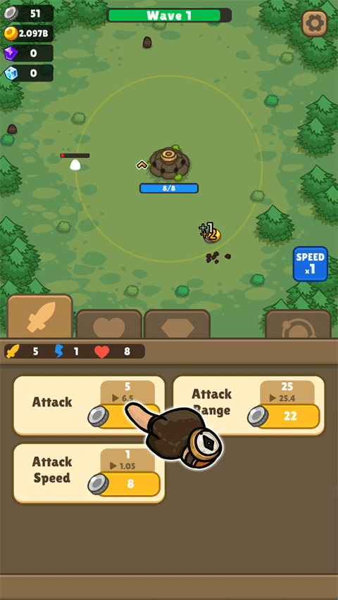 2、在游戏中会有很多怪物接近炮塔,当敌人进入炮塔范围内后炮塔就会自动发起攻击,击败敌人会掉落金币,这时玩家就可以利用金币来升级炮塔的攻击、攻击范围以及攻击速度