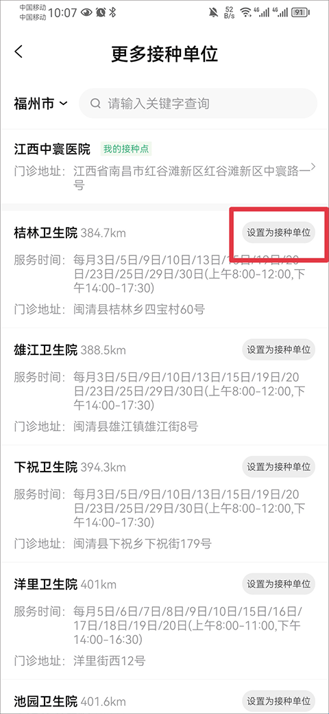 2、然后选择或搜索你要更换的接种单位