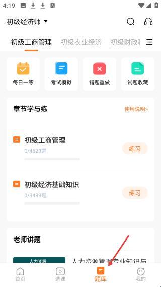 3、点击题库页题库含每日一练等模块,分章节练习,如初级工商管理有4623题,方便巩固知识。