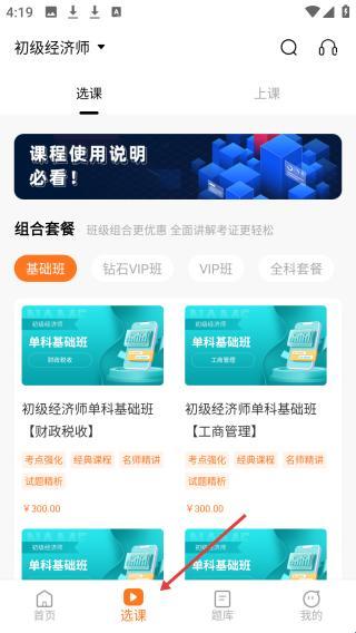 2、点击选课页面呈现课程使用说明,多种套餐与单科基础班可选,满足不同学习需求。