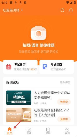 1、点击首页,有拍照语音搜题,展示考试日历、好课试听,助考生规划学习。