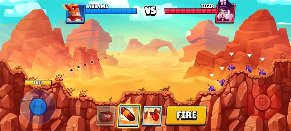 3、进入游戏后,通过滑动左侧的方向键来控制坦克移动,移动到合理的位置时,选择你要发射的技能,点击"FIRE"进行射击;